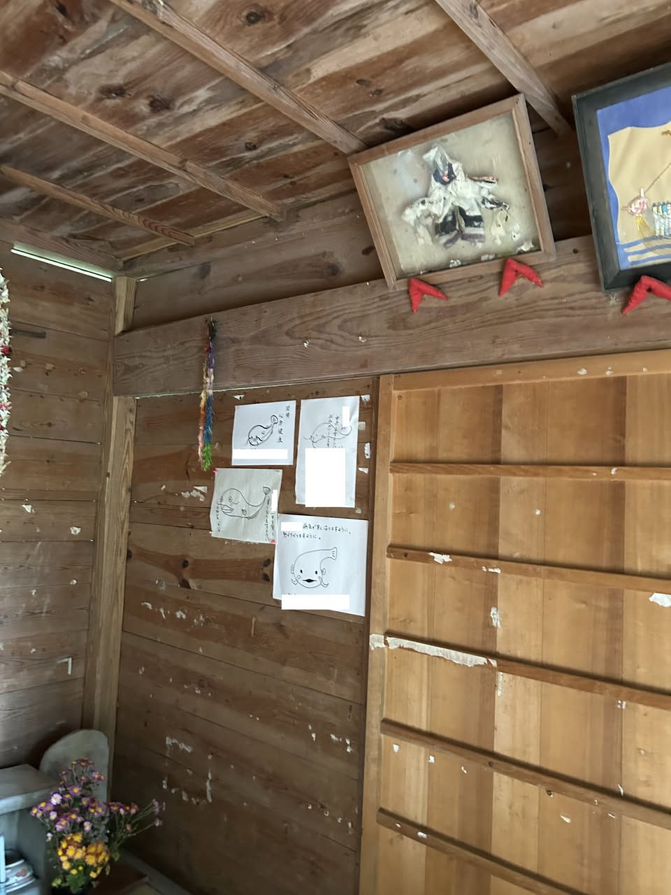 資料によればナマズの絵を貼る習わしは「皮膚病治癒に霊験あらたか」と評判を得た時代の名残とされています。現在では祈願内容も多様化し、子宝(最も多い)、夜尿症、健康、皮膚病 など、さまざまな願いが込められています。また、この地域ではナマズの絵は満願時ではなく、祈願をする際に貼るのが習わしとなっています。自治会長ご夫妻のお話によれば、堂内に納められたナマズの絵は、一定期間ごとにまとめてお焚き上げされ、その慣習は今も継承されているそうです。