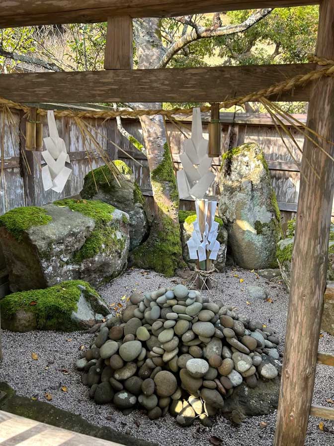 まず一つ目は、出雲大社から北東へおよそ10 km、車で15分ほどの国富町にある要石。私有地にあり、板垣で囲まれた場所に五つの要石が祀られています(写真①)(写真②)。この要石は、仁寿元年(851)の大地震以来、「地震鎮護の神」として信仰され、国引き神話に登場する八束水臣津野命が、引き寄せた土地を安定させるために打った杭がこの要石だと伝えられています。そのため、この地域では地震の被害が少なく、安政年間や明治5年の大地震の際も、要石近辺には被害がなかったといいます。 この要石の前には丸い小石が積まれており、その小石を持ち帰って地滑りが起きやすい場所にまくと、災害を防ぐことができると伝えられています。