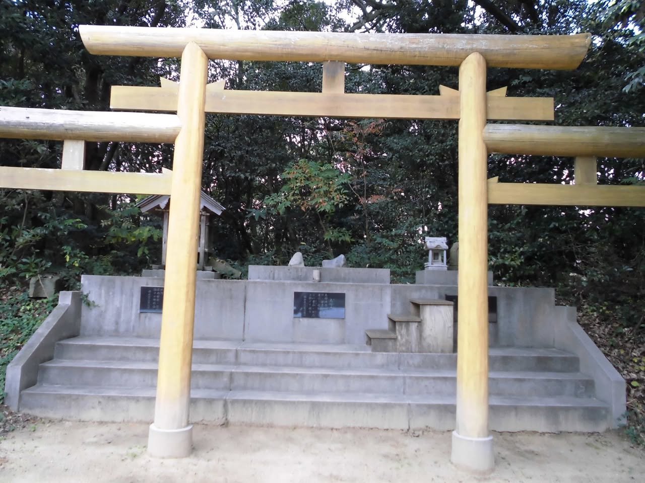 もう一つは、出雲大社から東方、直線で約8〜9 km、車で約10〜15分の位置にある鹿島神社(写真③)。こちらの要石は、祭神・俚俗明神の要石として、飛び地の境内に祀られています(写真④)。『雲陽誌』には、この要石について、地上75cm、周囲90cmで、かつて洪水の際にその根元が掘れて、約2.1mほど現れたといいます。宮司様のお話によると、この要石も国引き神話に基づくもので、八束水臣津野命が打ち込んだ杭と伝えられており、常陸国の鹿島神宮の要石とは別の由来を持っているそうです。地元では、地震や雷を防ぐ象徴として大切にされています。