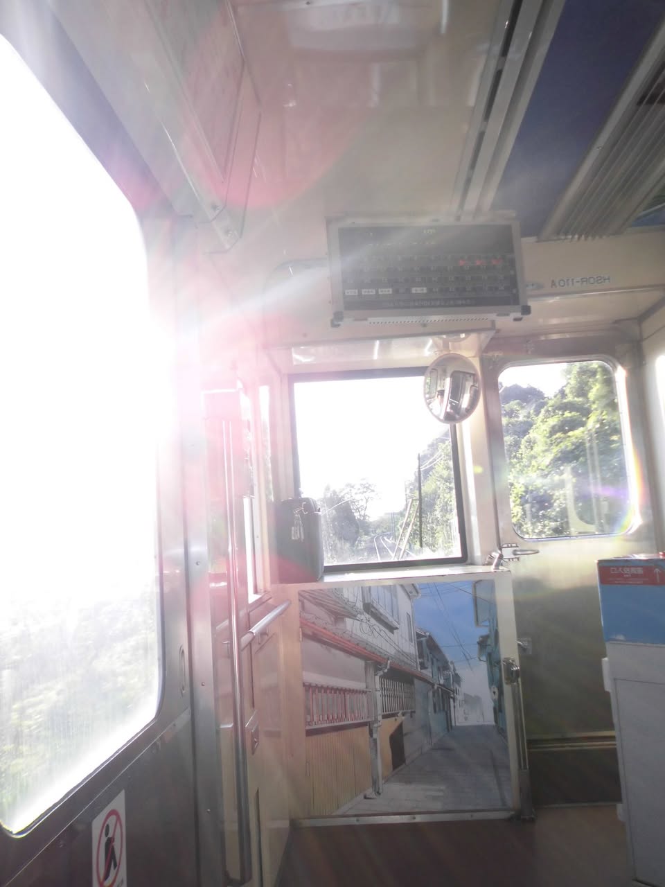 鮮やかな緑のトンネルを抜けたあとに到着する日奈久温泉駅。