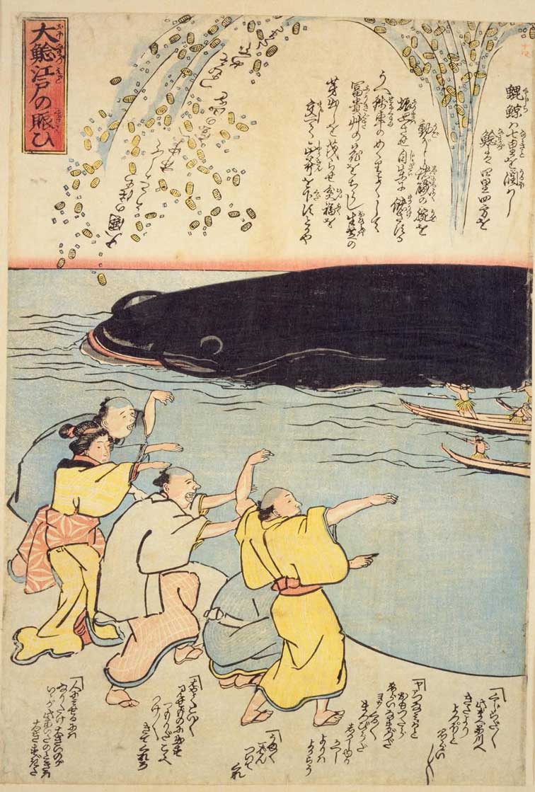 江戸湾に現れた鯨を捕らえる漁民と喜ぶ町人を