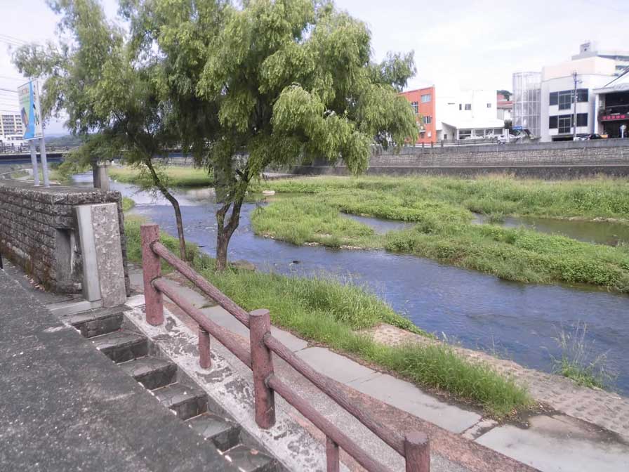 目の前を流れる本明川の下流、高城址(をカーブした)